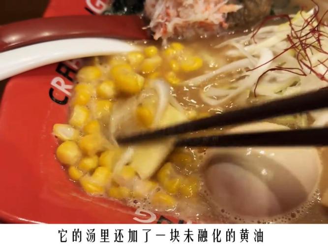 2. 第二家是一碗超級霸道的蟹肉拉麵,這碗連 100 塊人民幣都不到。兩片叉燒、整顆雞蛋,再加一大勺蟹肉和一大勺蟹泥,要是國內定價還不得 298 起步。正確的吃法就是先幹完一大勺蟹肉,再把蟹泥拌進湯汁裡,瞬間調製出神奇「魔藥」。叉燒鮮香濃郁,麵條根根掛汁,這真心是我這次來札幌吃到最滿意的一頓,快點給我火起來。還有一點很細節的是它的湯裡還加了一塊未融化的黃油。