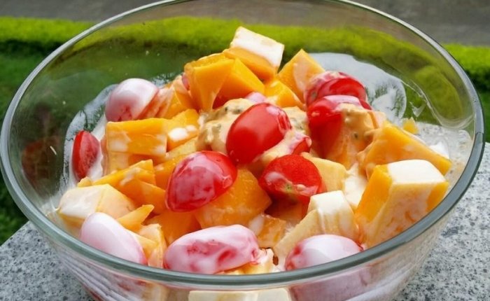 - 組合與調味: 將百香果醬汁淋在步驟1的水果蔬菜上,用刮刀或大湯匙非常輕柔地翻拌均勻,避免把脆口的水果弄爛。