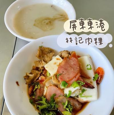 來東港一定要吃的就是這一碗肉粿,每到中午時刻外面總是會大排長龍,肉粿裡面的配料有櫻花蝦、肉片、香腸與白粿,最後在淋上蝨目魚熬煮的高湯,有一點稠稠的,每一口都可以扒附在粿上,很道地的小吃,有湯的跟乾的可以選擇喔!
